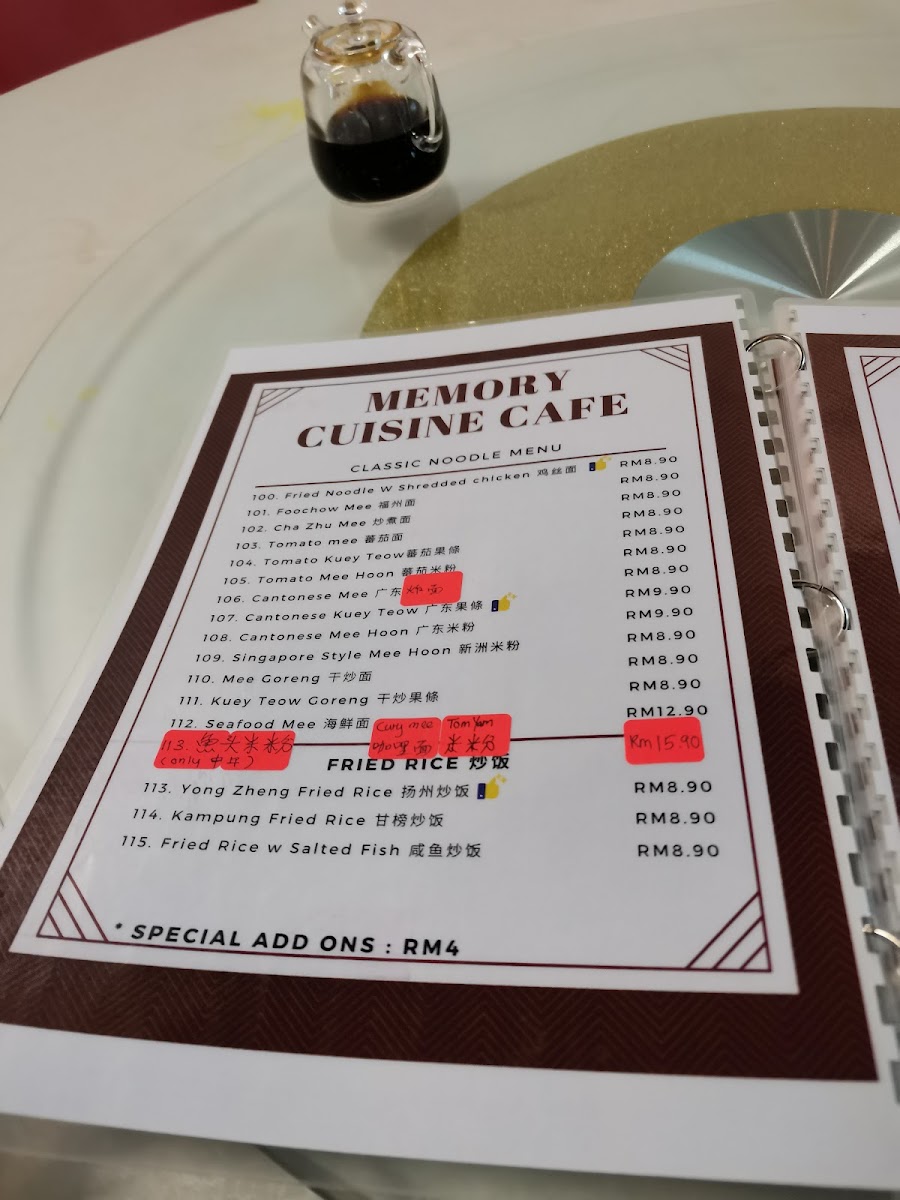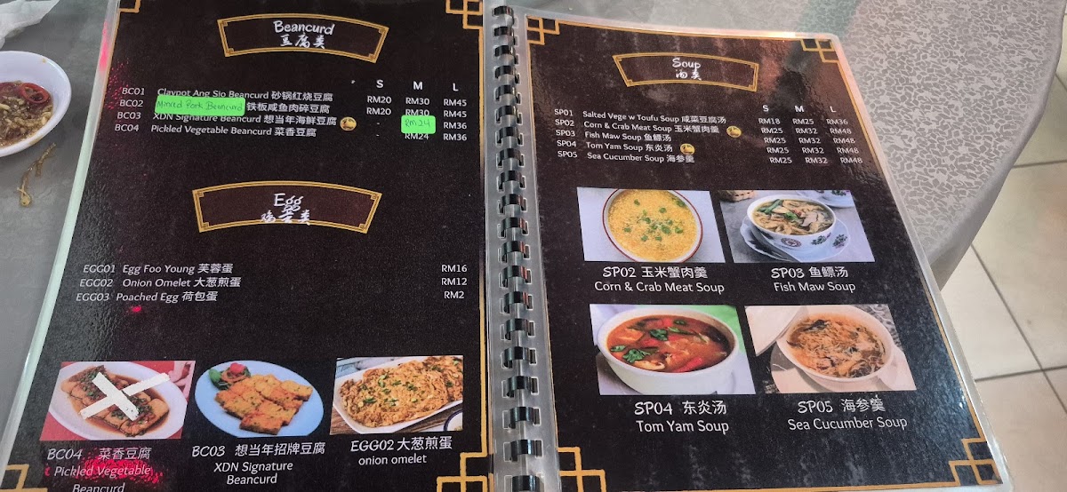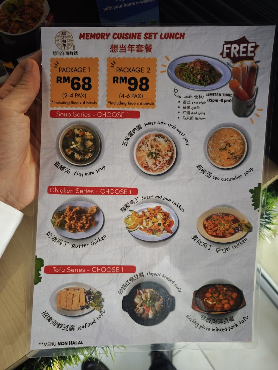 The menu at Memory Cuisine Cafe features a variety of Chinese dishes, primarily focusing on seafood, meat, and vegetable-based options. Visitors can expect to find a range of main courses that include claypot specialties, fried rice, stir-fried vegetables, and braised pork dishes. The menu also offers set meal packages suitable for family dining, which typically include a combination of tofu, meat, vegetables, soup, and rice.